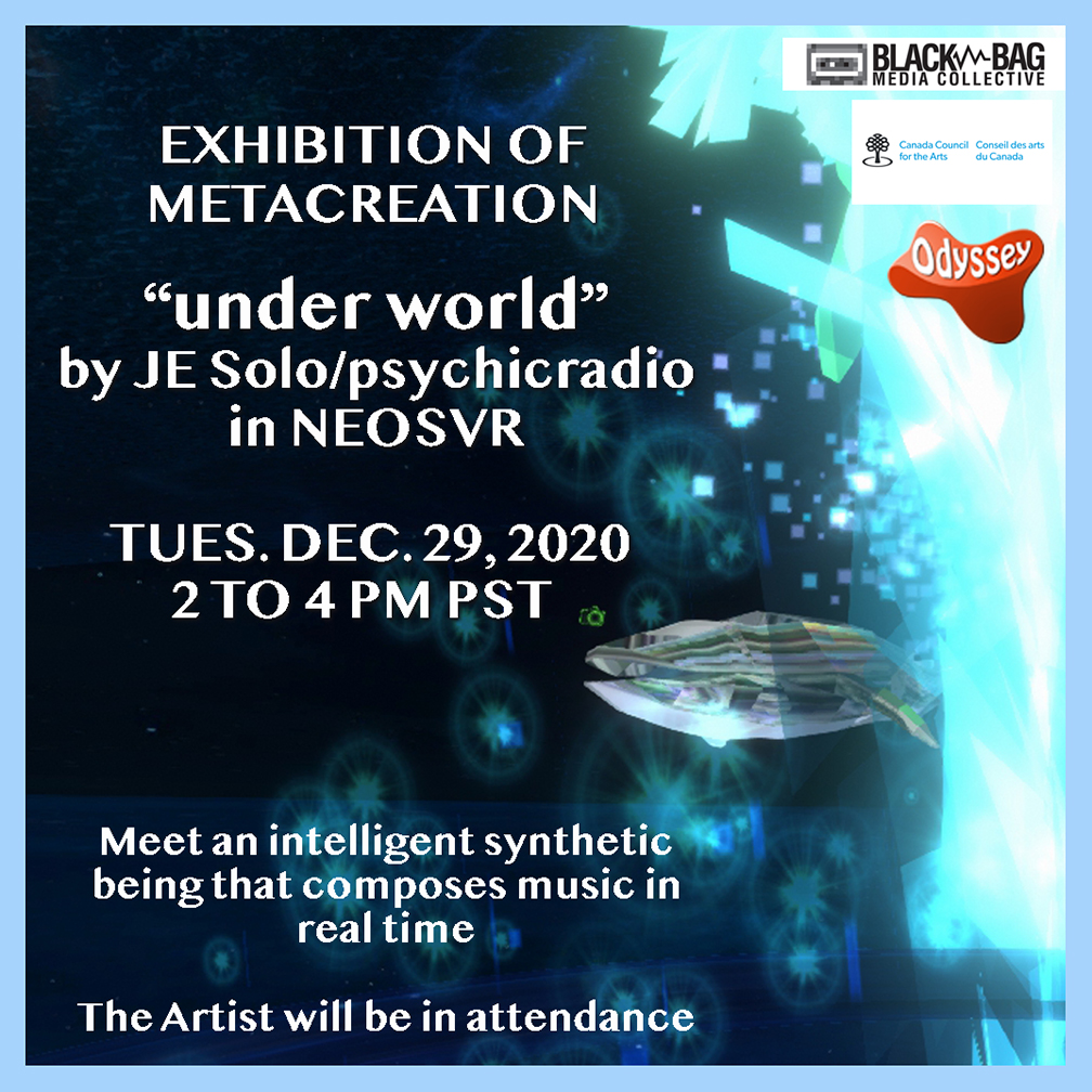 JE Solo has built an underwater environment to house their creation – a set of twin NPC (Non-Player Character) Whales that plays AI generated audio as they interact with users. JE’s exhibit opens on Odyssey in NEOS VR on December 29th, from 2 – 4 PST and the event will be streamed live to the BBMC’s Twitch Channel. You can also search “under world” in NEOS to visit the installation and meet the whales anytime.